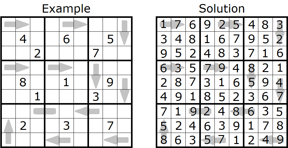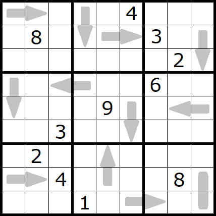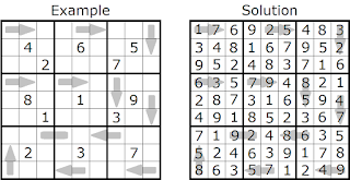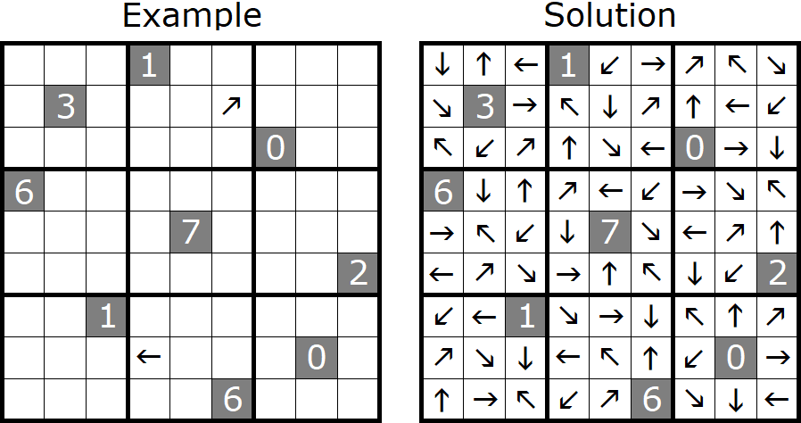 Rules Puzzle #1 (highlight if needed): Each marked 2-cell area contains a 2-digit number, read left to right or top to bottom. The first marked 2-cell area seen by an arrow must contain a larger 2-digit number than the arrow.