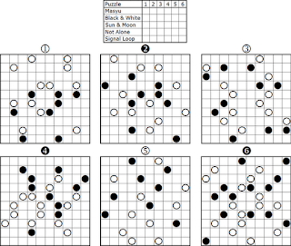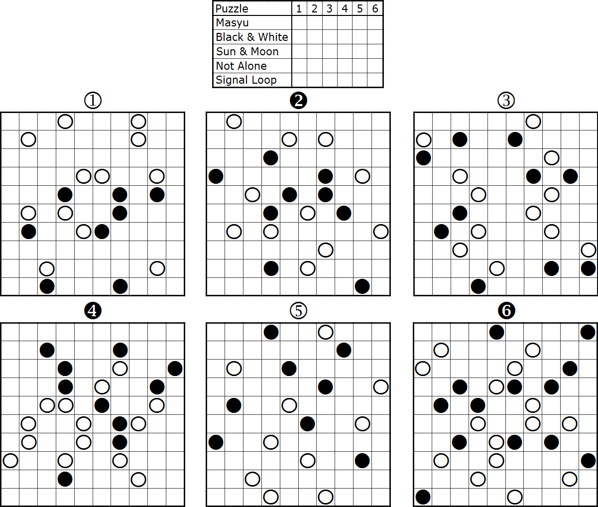 There are 6 puzzle grids given with black and white circles and 5 puzzle types. Match each type to one puzzle grid and solve it under that rule. One of the grids won't be used. Certain grids might be solvable under multiple rules, but it's only possible to match them in one way so all 5 rules can be solved in a seperate grid.